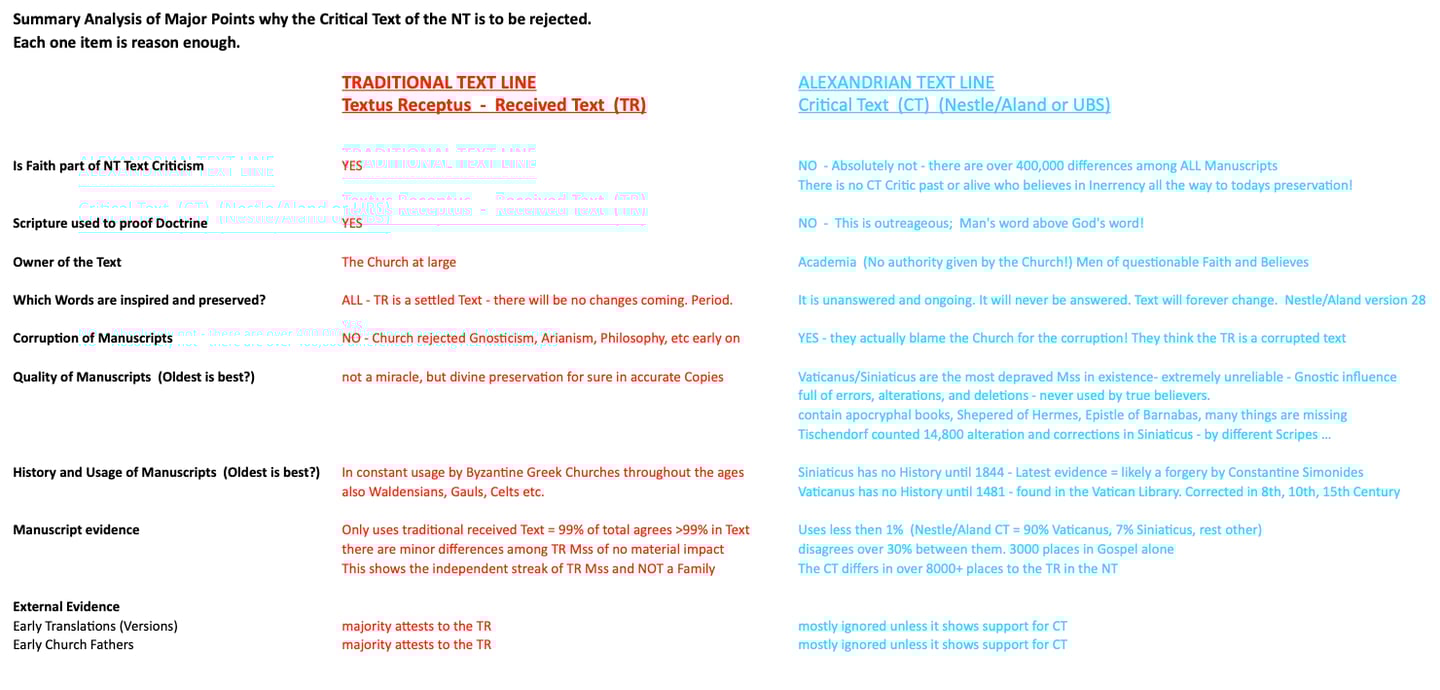 The Critical Text is also called: Alexandrian Text, Minority Text, Modern Text, Nestle/Aland, UBS