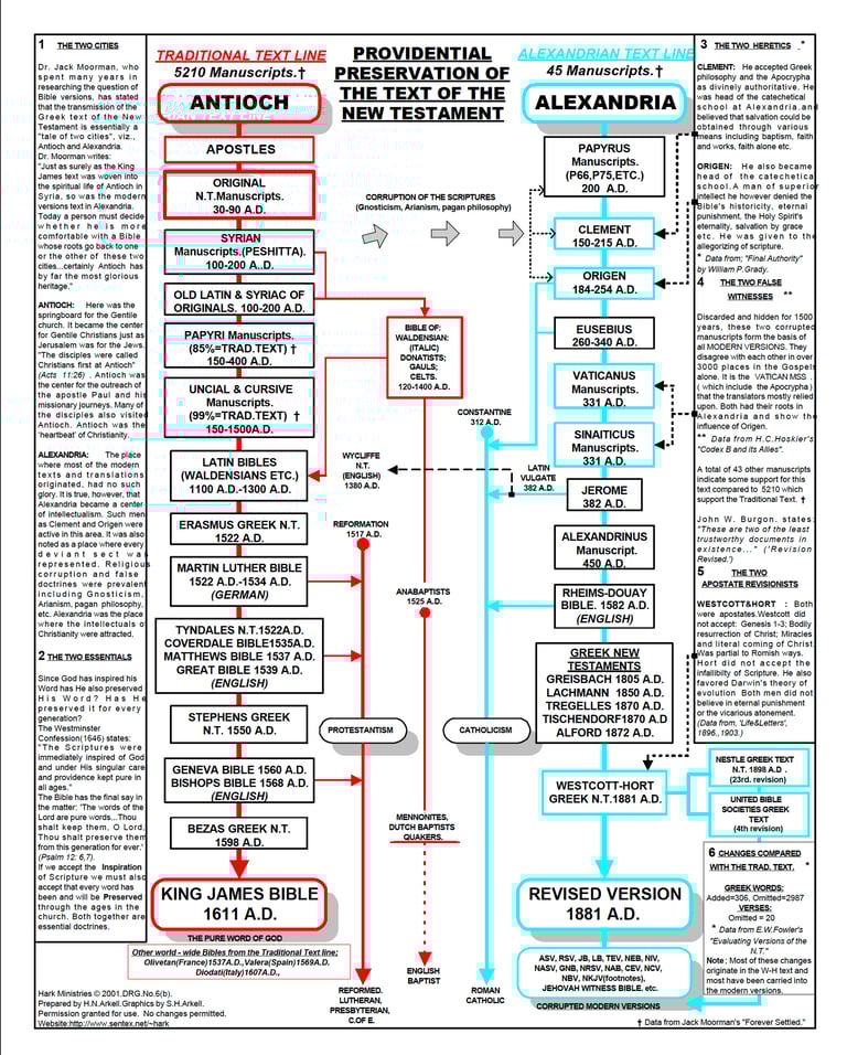 Reject the very recent - always changing - Line of corrupted Manuscripts (Alexandrian). This Text mainly uses 2 highly corrupted Manuscripts which greatly disagree with each other and the Traditional Line. All the missing Words and Sentences in modern Bibles - and there are many of them - come from this Line